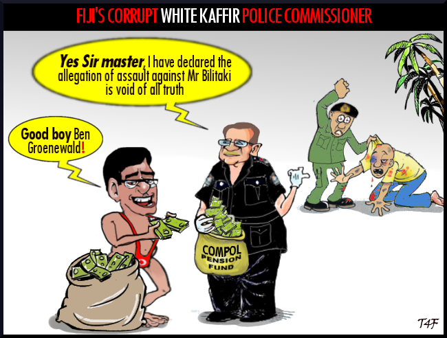 Josefa Bilitaki (60) confirmed that he sent an angry text message to the Prime Minister’s phone last Friday about the unauthorised use of his songs during the recent election campaign. Later that night a police officer and four soldiers turned up at his house, no doubt on the instructions of the immature baby dictator, Bainimarama, and took him to another location where one of the soldiers punched and slapped him in the face and mouth, bashed his head against a windscreen, and threatened to kill him. Then the new and useless police commissioner Ben Groenewald visited Josefa in hospital and reported that “The allegation of assault against Mr Bilitaki is void of all truth,” Deliberately ignoring Bilitaki's bruises and split lip. This is what Ben Groenewald used to do in South Africa, under apartheid. Our new police commissioner Ben Groenewald is showing all the signs of being a lackey to the military and not having the fortitude and gumption to publicly state that the signs and statements by Josefa Bilitaki and his daughter need investigating. Click HERE to read more.