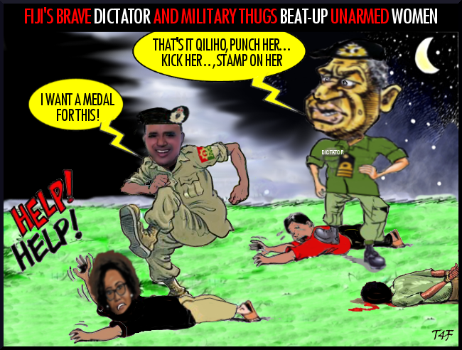 Ms Buadromo claims to have been kicked, punched, stamped on and was even made to lick the boots of soldiers.  Sources also reveal that Fiji’s coward “dictator” Frank Bainimarama was present and took part in the beating of women that shameful night. The coward military commander also jumped up and down on the back of a pregnant woman, killing her unborn child, said the source.